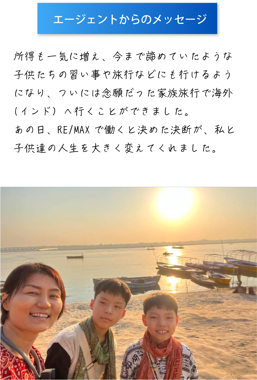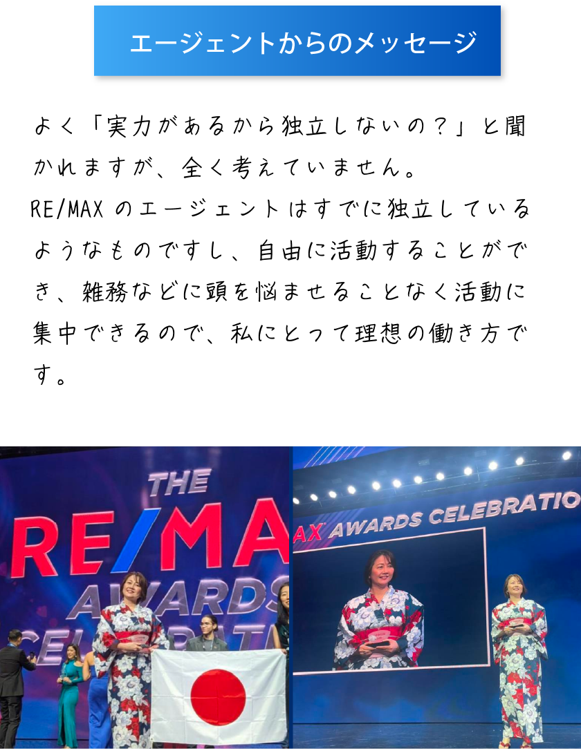 色々模索していた時に、RE/MAX JAPANのホームページで『不動産エージェント』というフレーズが目に留まり、まさに自分が探し求めていた働き方だと思い、本部にコンタクトを取りました。