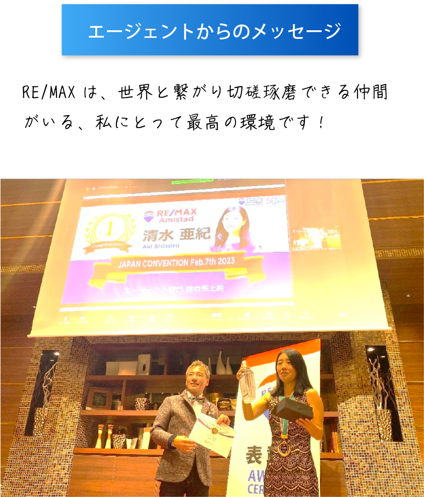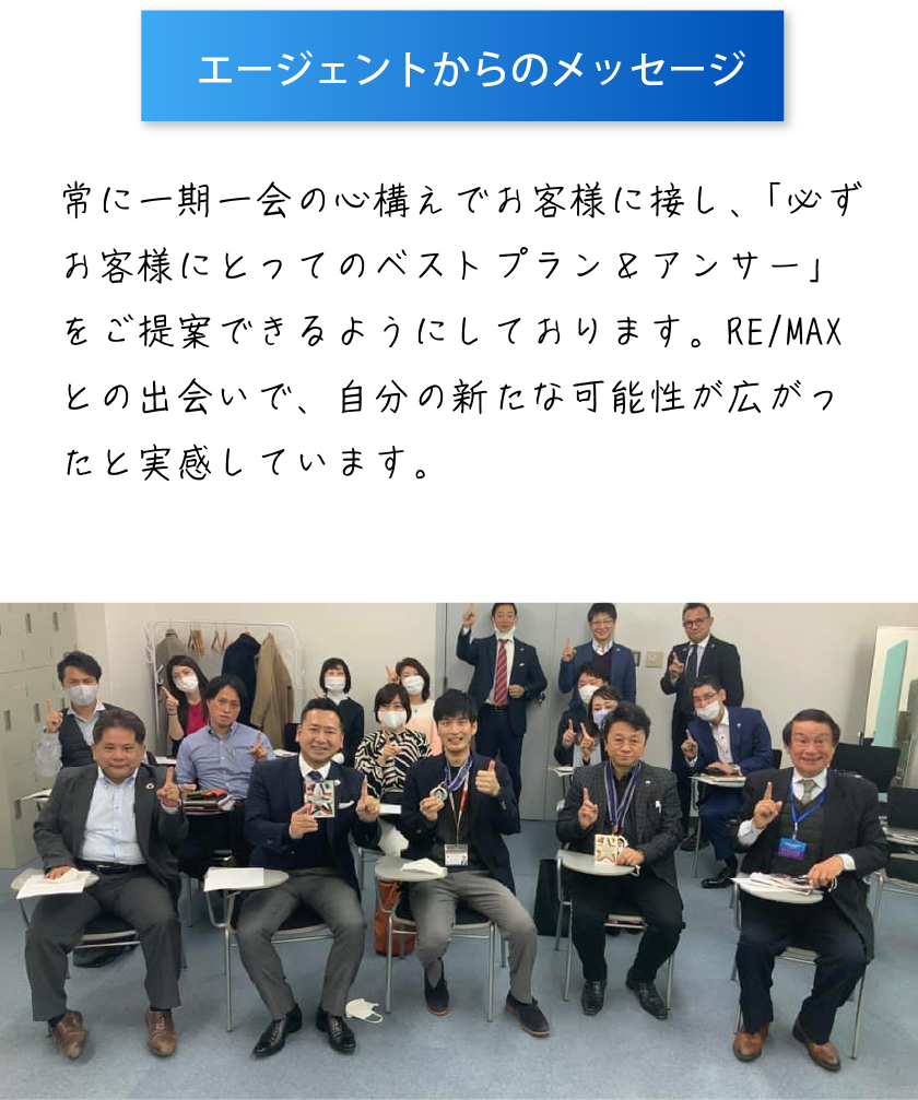 業界経験豊富なエージェントとの出会いで未経験者へのサポートが強化できるようになったり、外国語が話せるエージェントとの出会いでグローバルな取引ができるようになったり。と、様々な方との『出会い』のおかげでチームとしてパワーアップしていくことができています。こうして RE/MAXを通じてでないと出会えなかっただろう方々と今一緒に、 新しい世界を見られることに幸せを感じています。